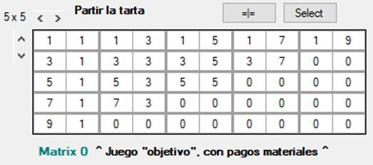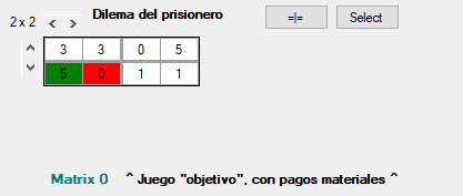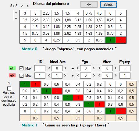 Como es habitual, cada resultado del juego consta de dos pagos: el de la izquierda es el del jugador que elige filas (jugador filas = jF) y el de la derecha, el del jugador que elige columnas (jugador columnas = jC). En la figura 1, Matrix 0, tenemos un dilema del prisionero en el que pueden elegirse grados de mayor o menor cooperación, y no sólo los extremos habituales de cooperar y defraudar. Así, cada jugador puede elegir entre cinco estrategias diferentes. Por ejemplo, la esquina superior izquierda representa el resultado de la cooperación mutua. Los resultados se representan como la intersección del par de elecciones tomadas por los jugadores, según el número de fila o columna, separados por un punto y coma. Las filas se numeran de arriba abajo y las columnas de izquierda a derecha. Además, si procede indicar el pago que un cierto resultado ofrece a cada jugador, se indica la cifra a continuación de la fila o columna escogida, separada por el signo de igualdad. Por tanto, el resultado de la esquina superior izquierda y los pagos que obtienen jF y jC se expresan como F1 = 3 ; C1 = 3.