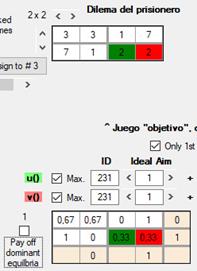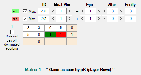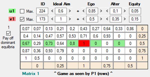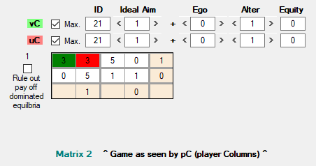 Con la misma Matrix 0 del DP, pero ahora con w = 1, a la que sólo le importa la equidad (Ego = 0, Alter = 0, Equality = 1), vemos que produce el mismo pago máximo tanto para los resultados en el que ambos cooperan como para el fraude mutuo: