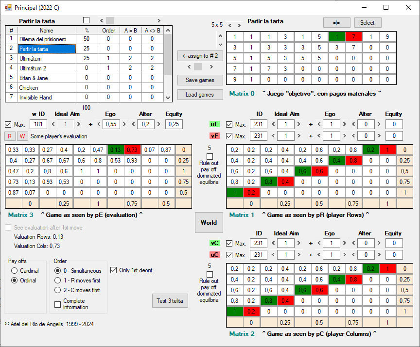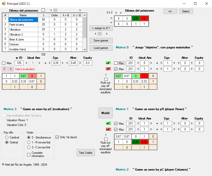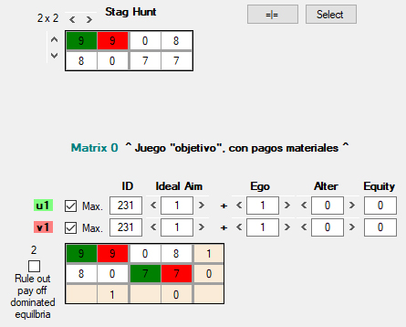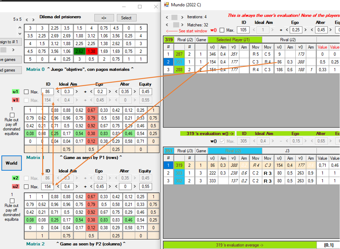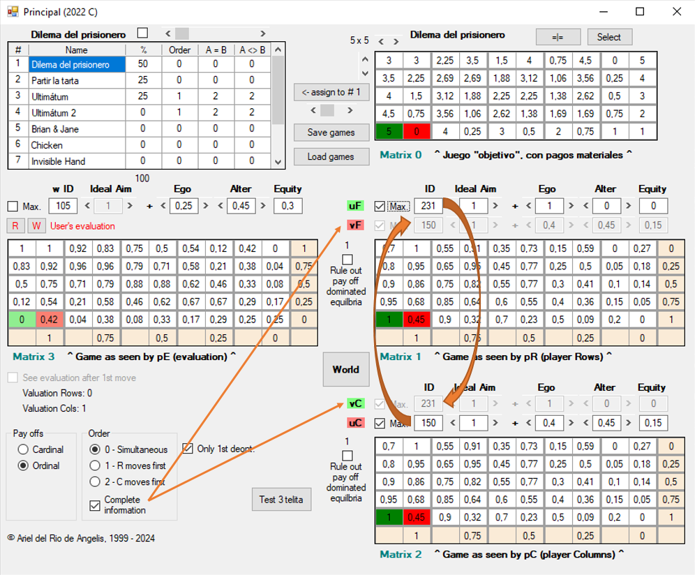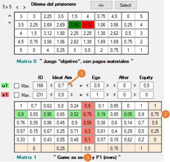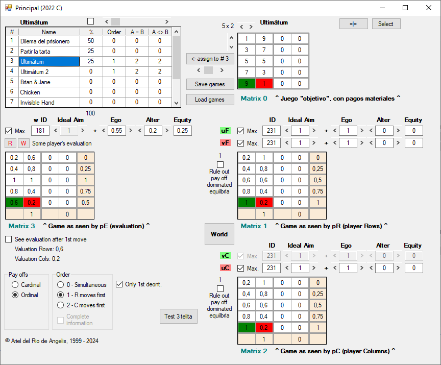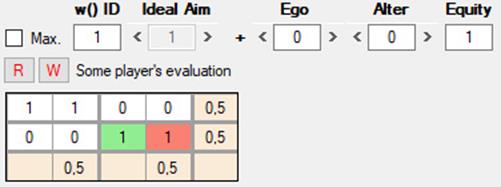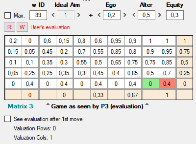 Además de los conjuntos U y V, cada agente cuenta con una función de utilidad adicional, w, que opera también sobre los pagos materiales (Matrix 0), y cuyo resultado se muestra en Matrix 3 [8], debajo de la lista de juegos. A diferencia de u y v, la función w sirve para evaluar las decisiones que de hecho ya se han producido en el juego, una vez que ambos jugadores las han tomado. Algunas consideraciones al respecto: