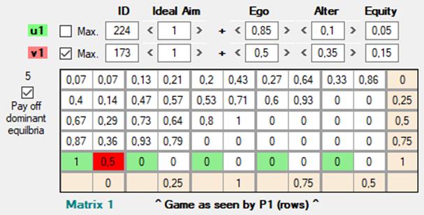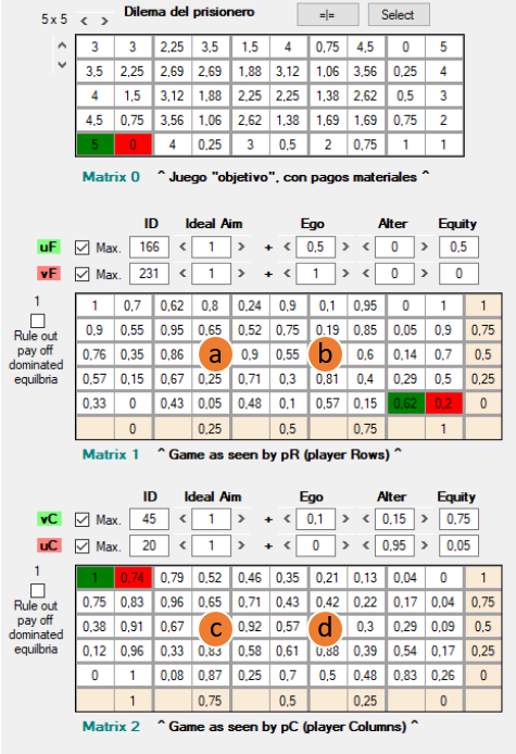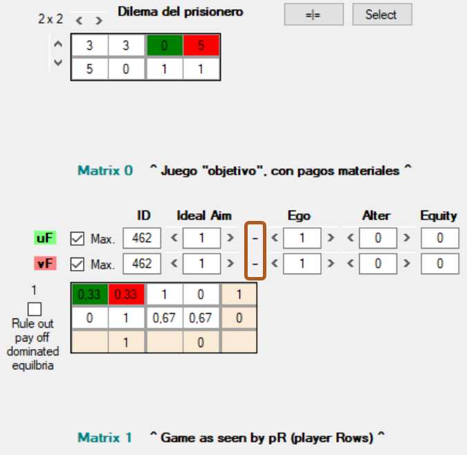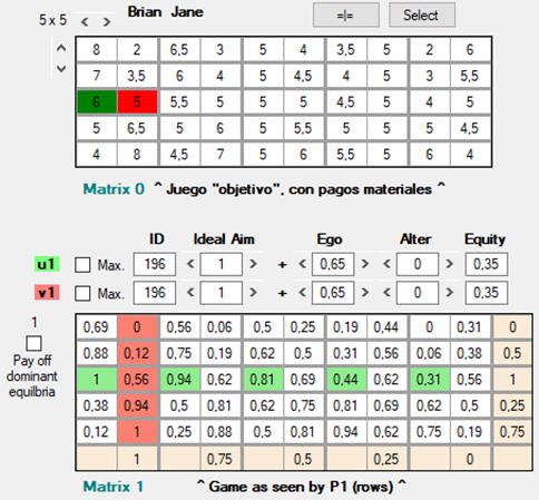 Las matrices de pagos Matrix 1 [5] y Matrix 2 [6] representan cómo jF y jC, respectivamente, “perciben” el juego. En cualquiera de las tres matrices, Matrix 0, 1 o 2, el par de casillas marcadas en verde y rojo representan el resultado del juego: en verde el pago que obtiene jF, y en rojo el que obtiene jC. En Matrix 1 y Matrix 2 los pagos que se muestran son ordinales y reducidos a una escala que va de 0 a 1, de ahí que sean diferentes de los mostrados en Matrix 0; más adelante explico en detalle la necesidad de esta transformación y cómo se lleva a cabo.