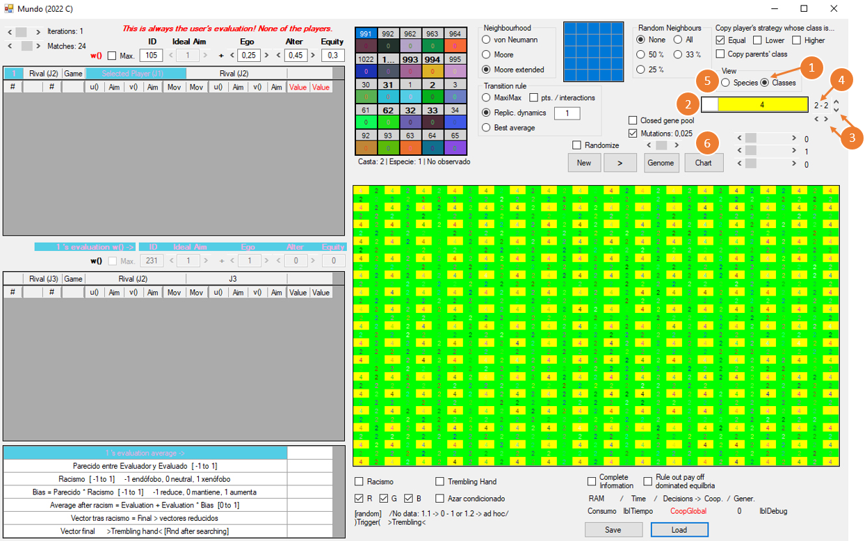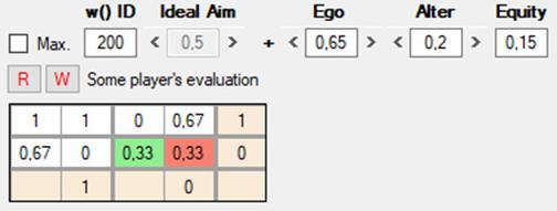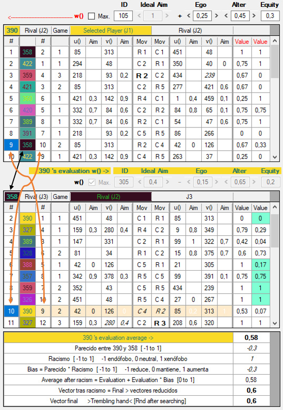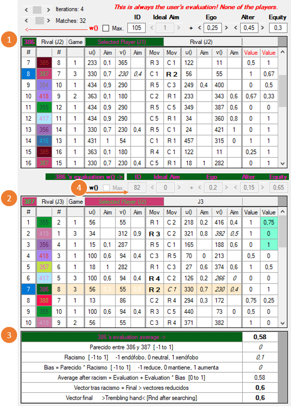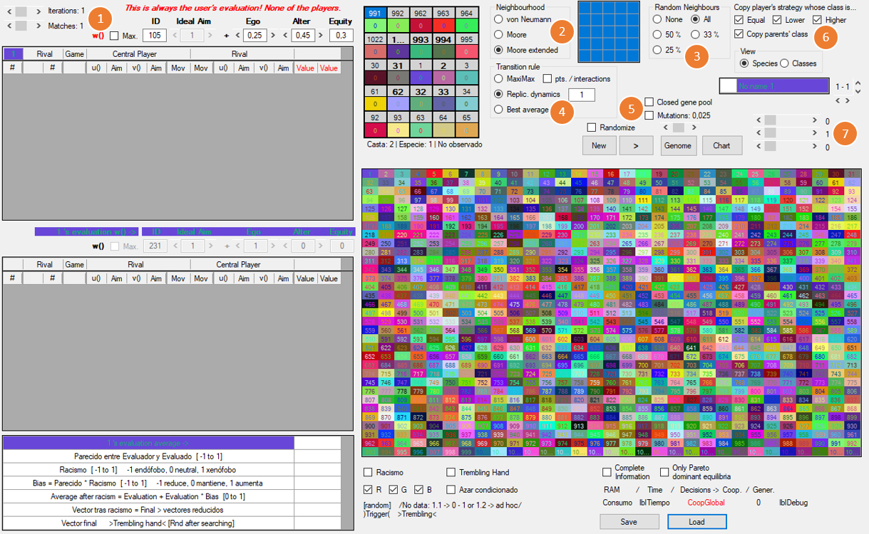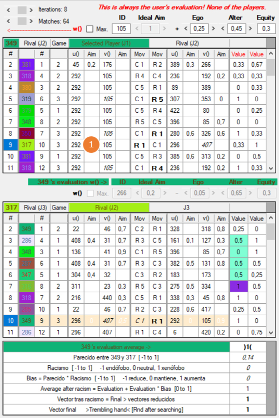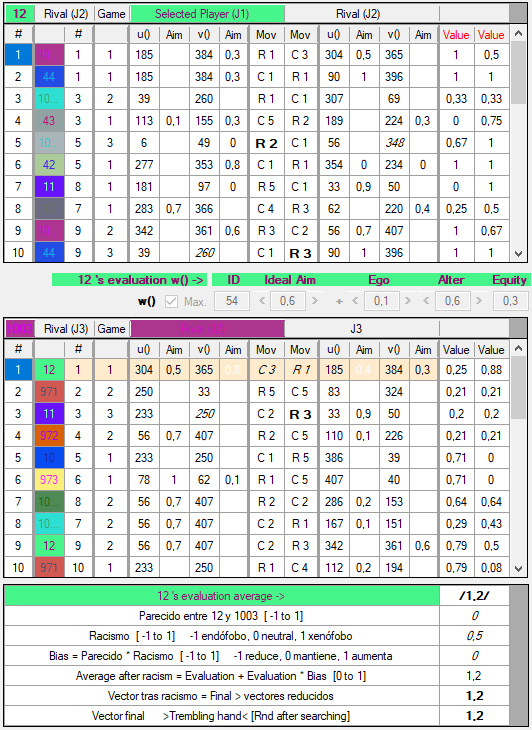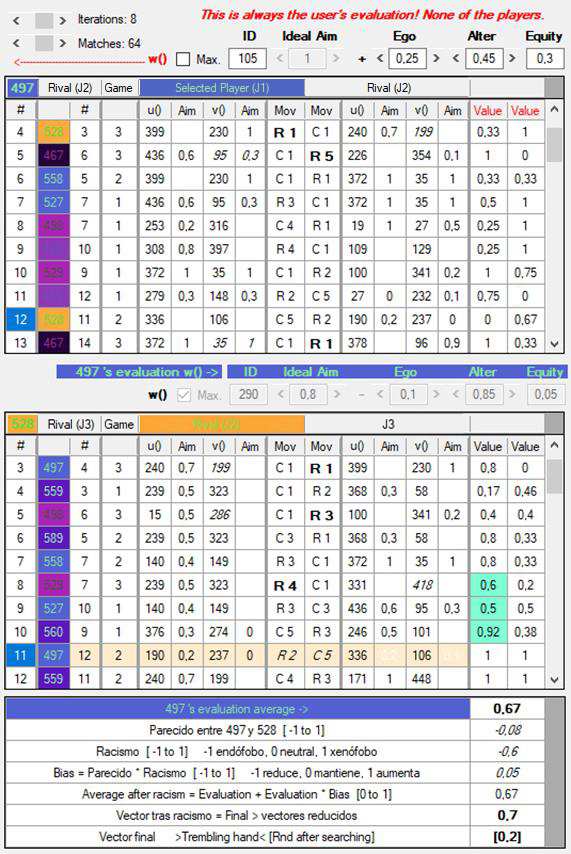 3) Las w de los jugadores están originalmente determinadas al azar y pueden ser totalmente ajenas a nuestras intuiciones de lo que sean la racionalidad o la moralidad. Es importante no confundir la w del usuario con las de los agentes artificiales. La w del usuario queda señalada en rojo (User’s evaluation) y tiene dos botones, W para escribir y R para leer: