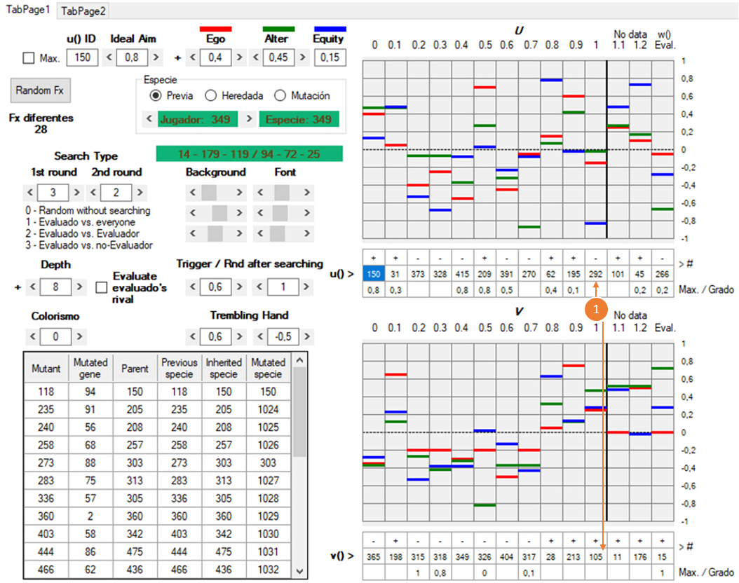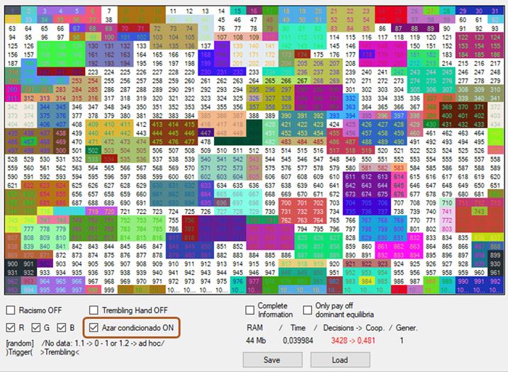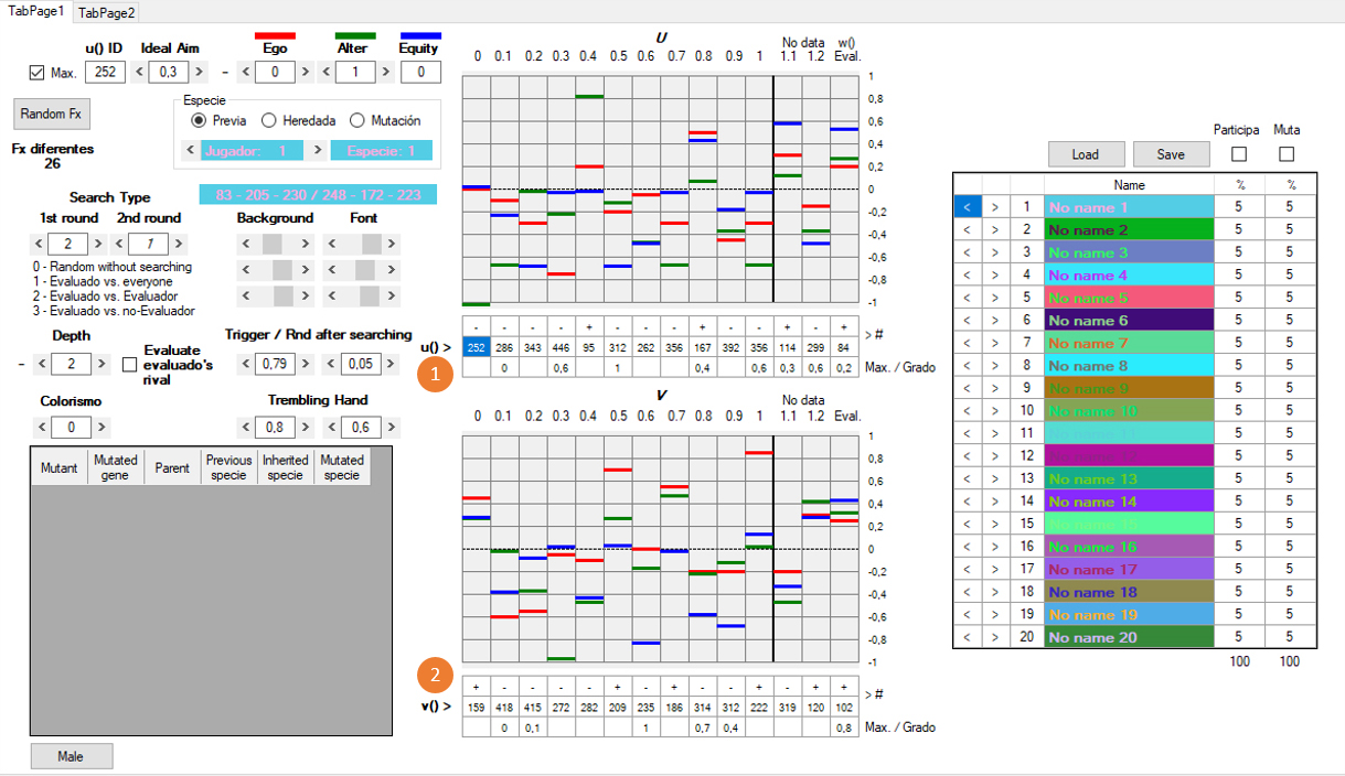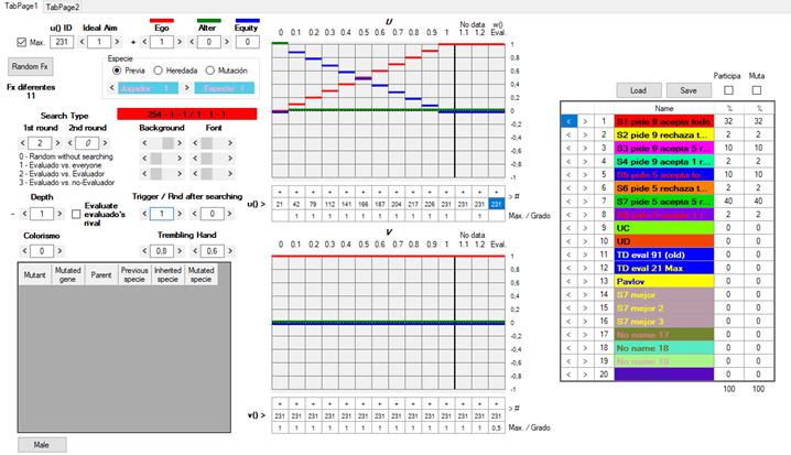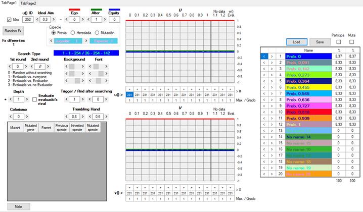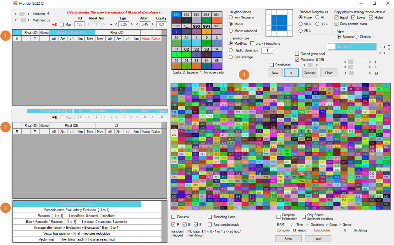 3) Las w de los jugadores están originalmente determinadas al azar y pueden ser totalmente ajenas a nuestras intuiciones de lo que sean la racionalidad o la moralidad. Es importante no confundir la w del usuario con las de los agentes artificiales. La w del usuario queda señalada en rojo (User’s evaluation) y tiene dos botones, W para escribir y R para leer: