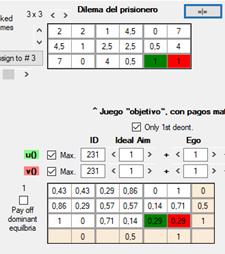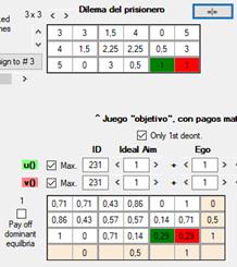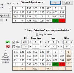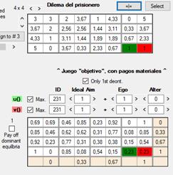 egoísmo (0.2), altruismo (0.5) y equidad (0.3).
