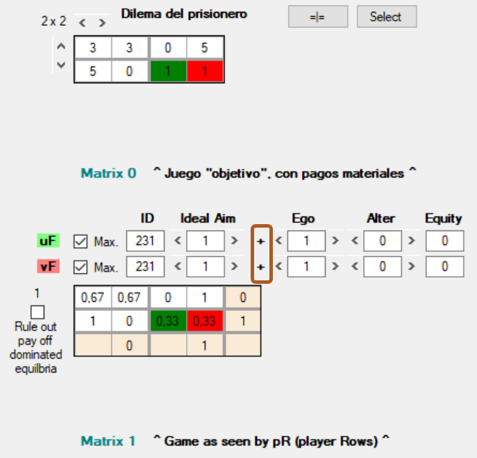 Una función de utilidad toma como argumentos los pagos materiales de jF y jC en cada resultado del juego, tal como aparecen en Matrix 0, y les asigna ciertos pesos relativos, es decir, una mayor o menor importancia expresada mediante tres magnitudes que operan sobre los argumentos. Estas magnitudes son el egoísmo (sobre los pagos de jF), el altruismo (sobre los pagos de jC) y la equidad (sobre la diferencia entre los pagos de jF y los de jC). En la simulación aparecen como “Ego”, “Alter” y “Equity”, pero aquí las designaré como α, β y γ, tales que α + β + γ= 1