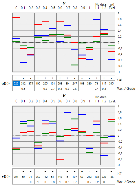 1) La función w puede ser cualquiera de las 462 (231 positivas y 231 negativas) que pueden encontrarse en U y V, pero se la considera separadamente para permitir una mayor flexibilidad en el modo en que los agentes evalúan conductas y reaccionan a ellas. (Las funciones negativas se explican más adelante).