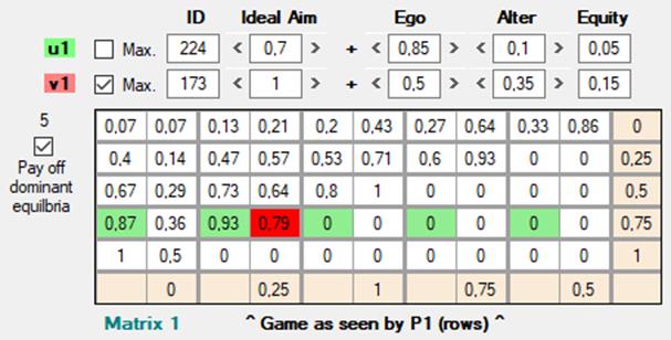 Los resultados más equitativos son los situados en la diagonal que va de F1 ; C1 a F5 ; C5. Obviamente, en términos objetivos este último resultado es mucho peor para ambos jugadores que el primero. Sin embargo, vemos que todos los resultados de la diagonal, evaluados con w = 1 (α = 0, β = 0, γ =1), obtienen siempre el máximo valor en la escala 0 – 1. Otras distribuciones de α, β y γ (Ego, Alter, Equity) producen funciones de utilidad con un mejor ajuste entre equidad y eficiencia.