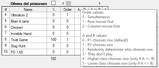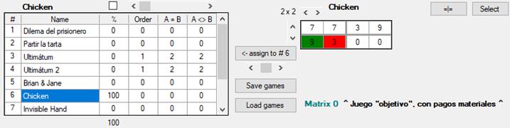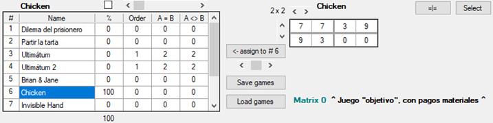Como ninguno de los dos conoce realmente las preferencias del otro, sino que deben emplear una función v a modo de conjetura, estamos ante un juego de información incompleta. Para tener el modelo más básico que propone la teoría de juegos, y que las preferencias de ambos jugadores sean de conocimiento común, podemos marcar la casilla Complete information (véase supra [7] en la figura 1).
