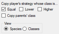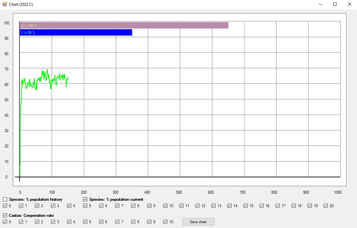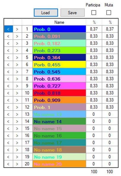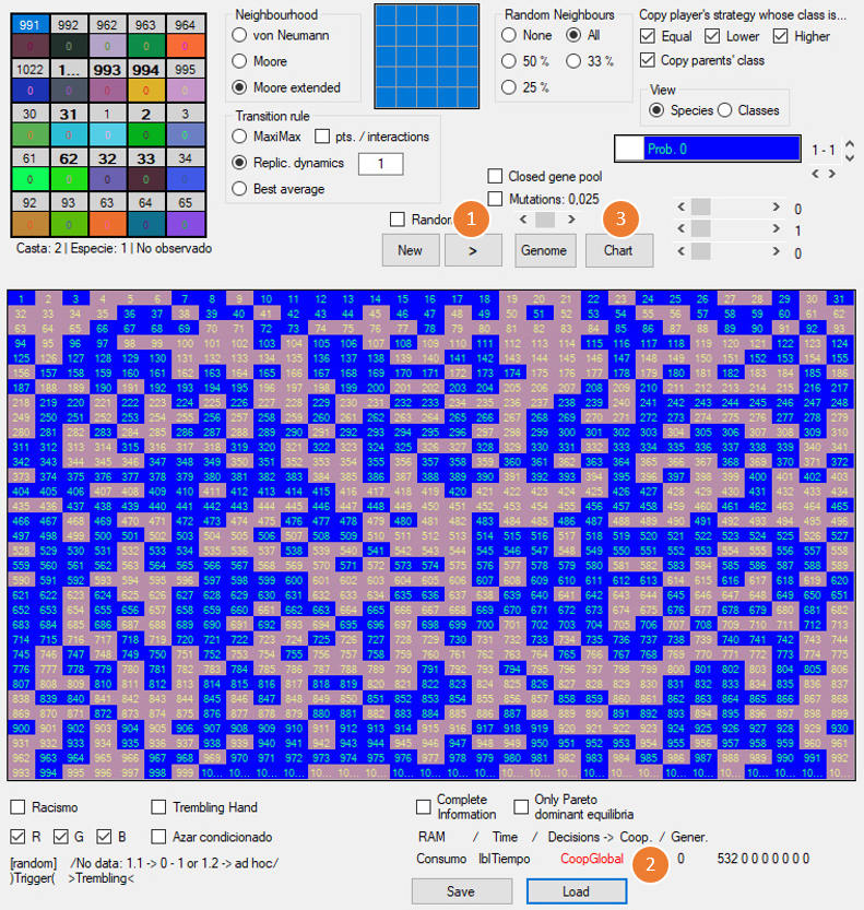 Para volver a ver las estrategias, seleccionamos Species [5]. A diferencia del juego del gallina, aquí no cargamos ninguna lista predeterminada de estrategias, ya que todos los individuos en la población inicial están generados al azar.